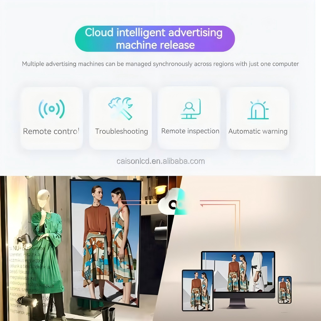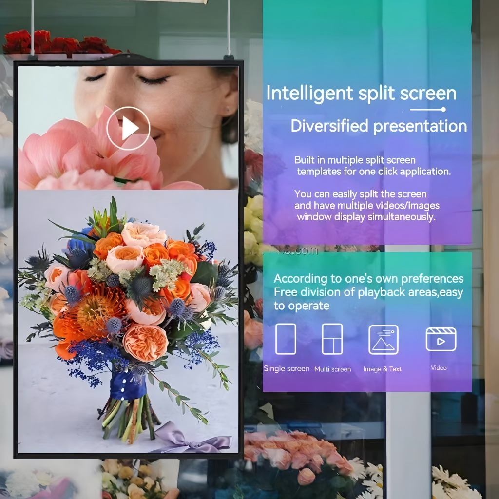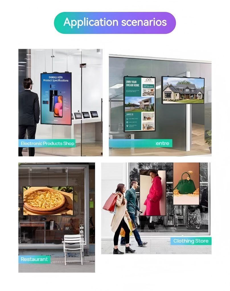 2. Serie completa de señalización digital: Incluye pantallas para ventanas colgantes, pantallas publicitarias de pared, pantallas publicitarias de pie y modelos sobre carrito móvil, todos con función táctil.