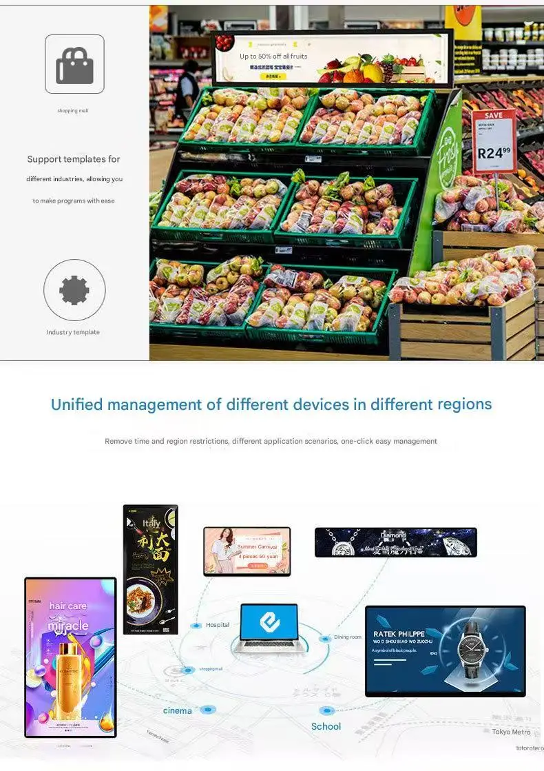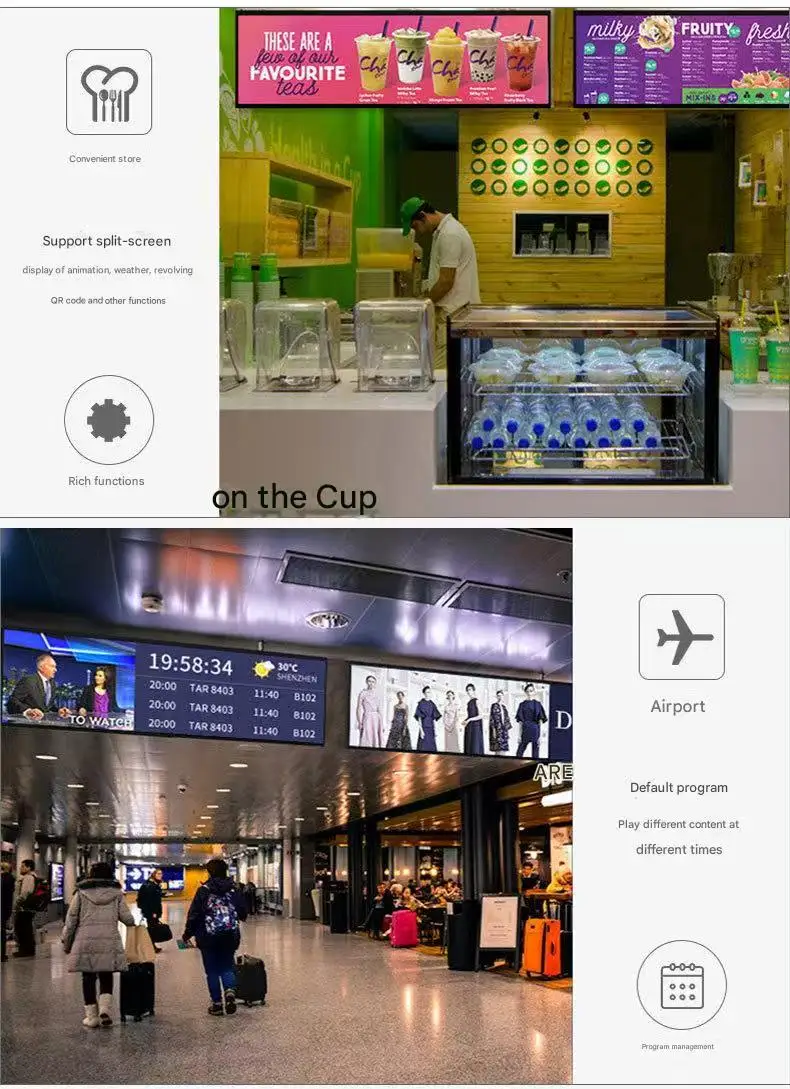 2. Full Series Digital Signage: Including hanging window displays, wall-mounted advertising displays, floor-standing advertising displays and mobile cart models, all support touch function.