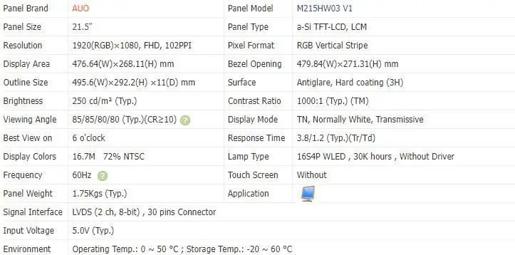 ➢ AUO 21.5 inch M215HW03 V1 1920x1080 lcd panel Backlight 250 cd/m2 LVDS applied Industrial digital signage Display M215HW03 V1